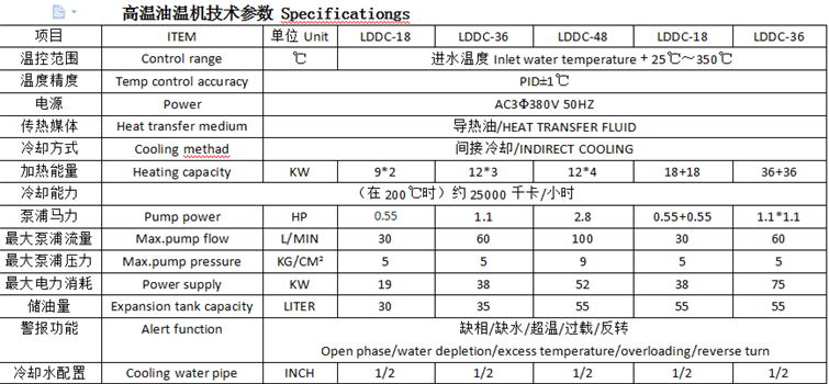 油温机循环泵浦采用台湾元欣高温循环泵(可按客户要求选择泵).泵浦功率可订做.采用双P.I.D自动调节智能温度控制器.触摸式控制.温控准确加热均匀.稳定安装简单.控制电源电压:3∮380V 50HZ.加热功率:加热系统采用独立法兰型不锈钢发热管(瑞典进口发热丝).节能.延长发热管寿命,功率可订做(大少可调).压铸油温机温控器:日本OMRON微电脑双组P.I.D液晶显示自动演型.控温精度±1℃.省电30%以上.电气系统:日本富士空开,施耐德电磁接触器.内部管路:不锈钢一体成型.管内热量损耗小.RS485通讯功能.实现自动化管理.设定值和实际值分别显示.独特的加热设计.温度自控.快速达到各种产品所需温度的要求.升降温速度快.温度精确均匀稳定.管路防爆装置安全可靠.