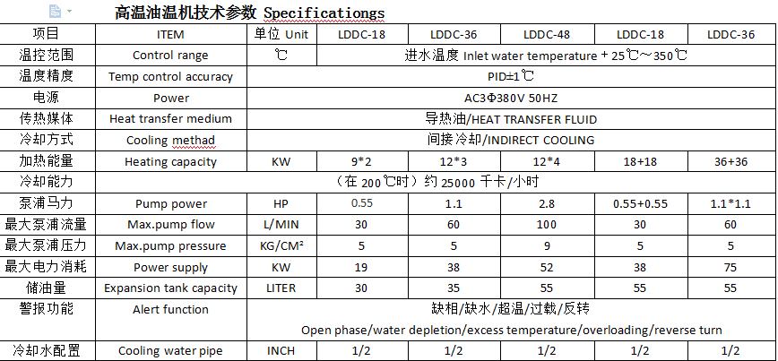 高温油式模温机热过载继电器保护泵浦过电流及警报指示灯.缺水保护(补水压力过低警报及指示灯.电源过电流无熔丝断路器.电源欠逆相保护,防止泵浦反转及警报指示灯.系统安全阀(系统压力超过自动泄压.BY-PASS压力调节阀.