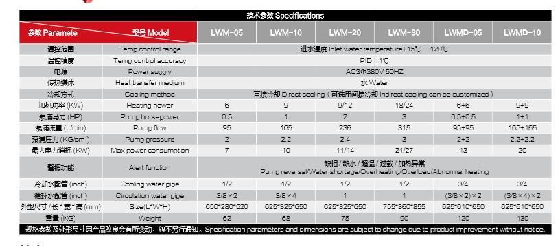 LWM系列水温机是以水为循环介质的模温机,也常被称为水温机/水加热器/水循环模温机/水温度控制机/水加热机/水模温机,其控制温度可分为98℃/120℃/150℃/180℃水温机。加热功率3KW-1200KW可选。择在各行业的使用非常普遍,在选择时主要依据加热功率,泵浦性能,冷却能力这几方面来进行考虑。相对采用导热油为循环介质的油温机来说,其换热效率更高,使用和保养也更简单和清洁,只需要连接自来水就可以使用。尤其在一些对运行环境要求较高的行业,具有非常大的优势。