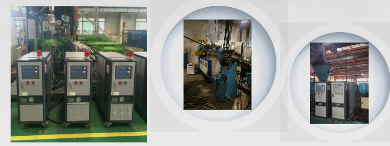 挤出机的规格不同,其控温区段的数量也会不一样,可根据不同的挤出机,采取统一控温或分段控温,物料挤出前,模温机需要将各被控区段的温度升高至预设值,在物料挤出时,由于机械能被大量转化为热能,模温机又需要通过热交换来将这些热量带走,达到温度恒定的作用。所以模温机在挤出设备上的应用可以看作是一个挤出机主机启动前的预热升温和主机运行过程中维持恒温的过程。挤出分段控温模温机案例:客户的挤出机每一个工艺段要求不同的温度控制,推荐客户使用双回路模温机或者多机一体模温机来控制温度,可以对挤出机设备中的各个工艺段同时进行独立的加热和冷却,从而达到一机多用的目的。如果对每一个工艺段使用一台加热设备进行单独的温度控制,也能达到其技术要求,但是费用高占地面积大。
